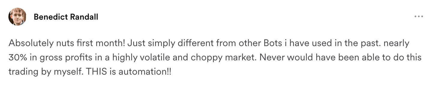 Our Smart Bots are designed to work for you, they watch the charts and identify the most profitable setups using our backtested, high-accuracy algorithm, resulting in perfect long and short entries 8 out of 10 times.